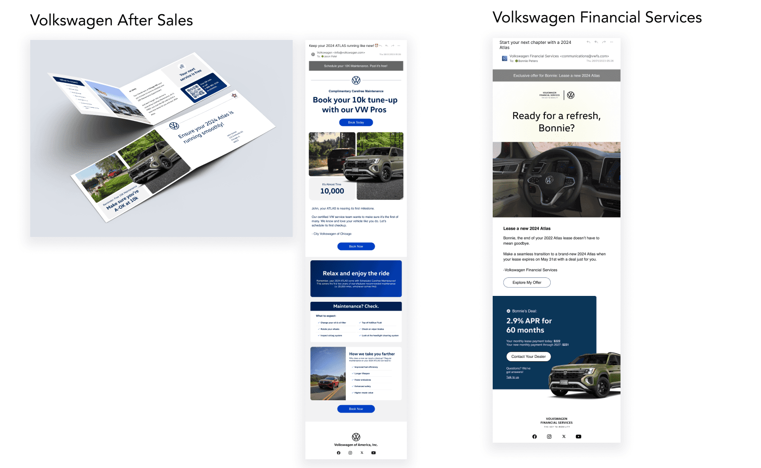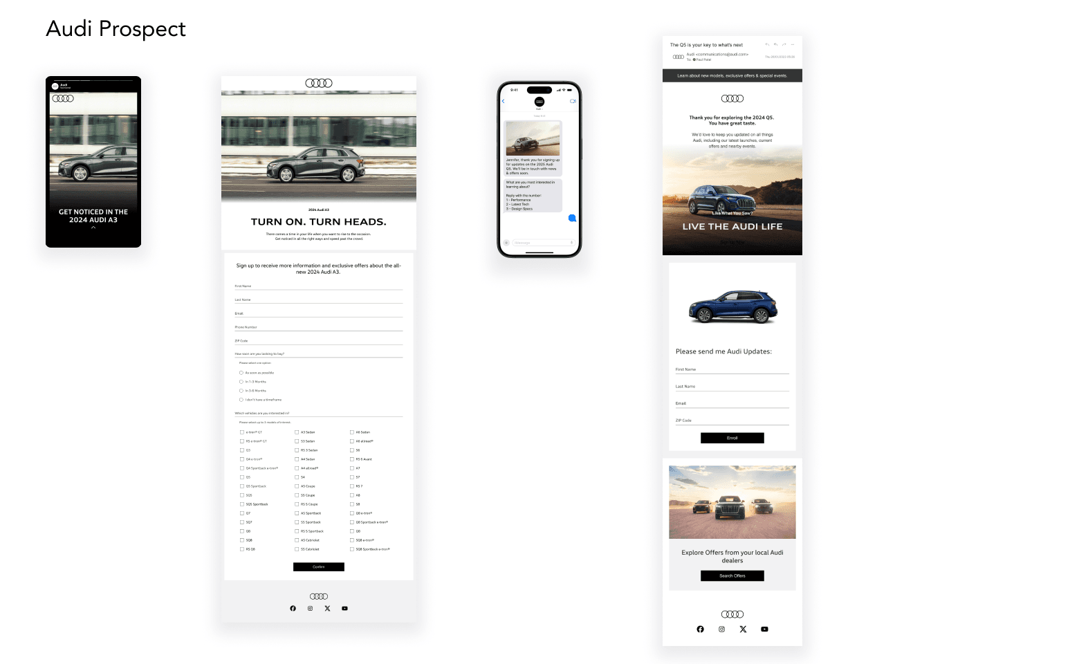 After researching similar market email templates, we searched for VW and Audi design systems, fonts and imagery that could be brought into Figma to start building out creative work. A real collaborate effort, our creative team divided the work and helped out however possible. Having done similar work with our client Harley Davidson, the team built out the CRM framework and we developed 30+ assets of emails, social and landing pages for prospect and new customers: